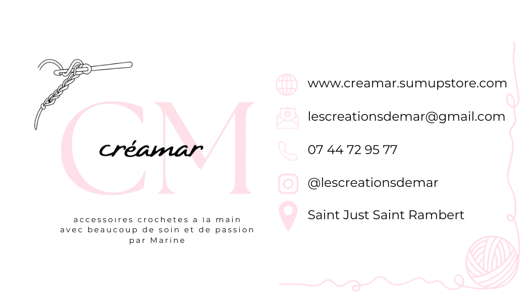 Marine propose une large gamme de créations faites main en crochet : sacs originaux, pochettes et trousses pratiques, bandoulières pour téléphone, paniers décoratifs, dessous de plats ou encore housses pour ordinateur et tablette. Chaque pièce est réalisée avec soin et passion, alliant utilité et esthétique. Des créations uniques, idéales pour offrir ou se faire plaisir, fabriquées à Saint-Just Saint-Rambert et expédiées dans toute la France.