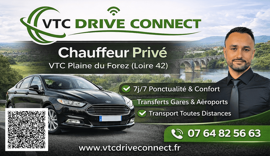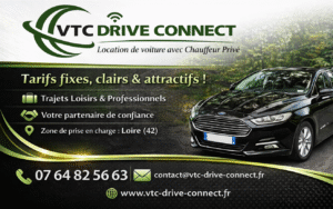 VTC Drive Connect chauffeur privé basé à Saint-Just-Saint-Rambert Plaine du Forez. Déplacements sur mesure, service premium et tarifs fixés à l’avance.